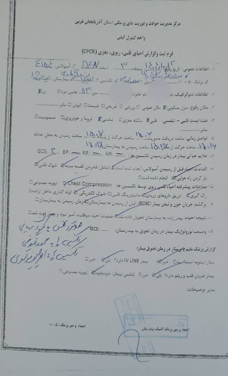 احیای قلبی‌ـ‌ریوی موفق توسط کارشناسان اورژانس ارومیه با همکاری موتورلانس و آمبولانس