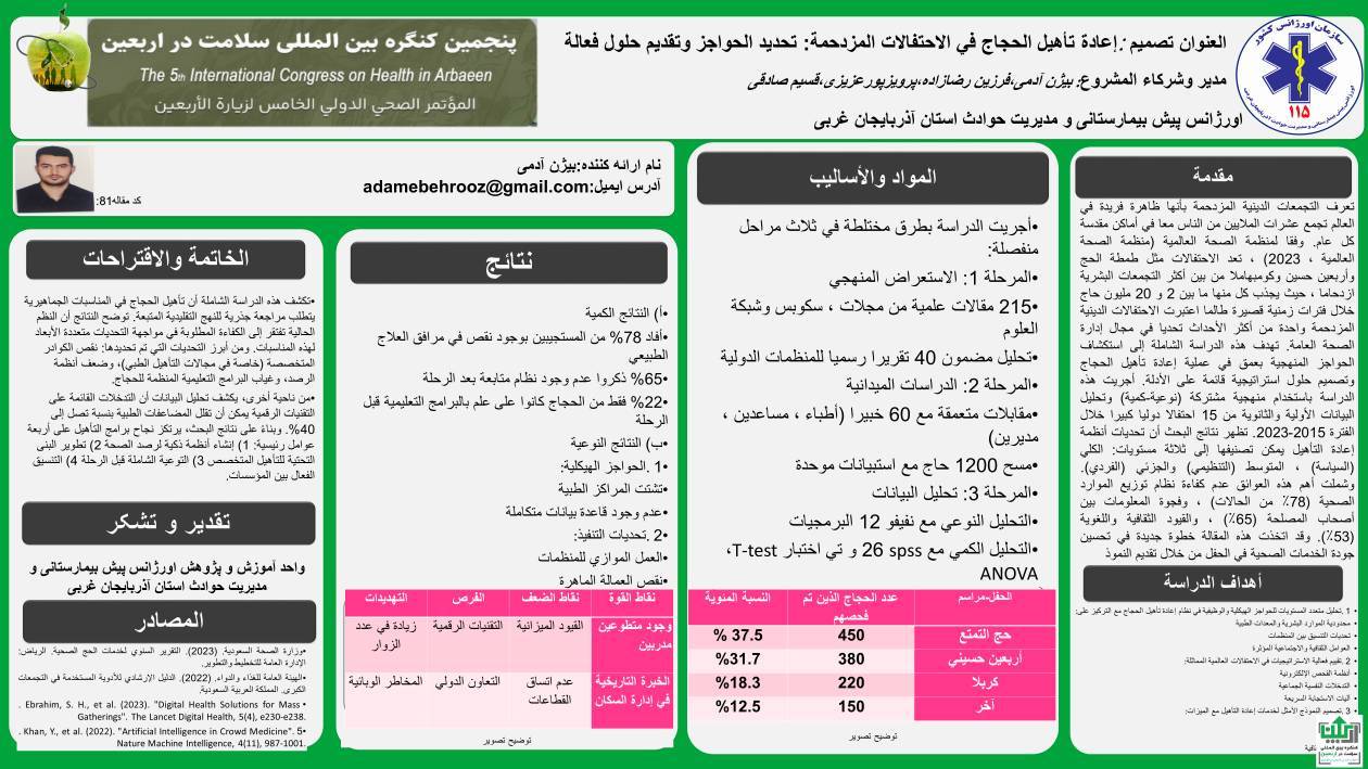 همچنین دکتر فرزین رضازاده رئیس سازمان اورژانس آذربایجان غربی، به همراه کارشناسان ارشد بیژن آدمی و قسیم صادقی به نمایندگی از اورژانس استان در این کنگره حضور یافته و ضمن ارائه دستاوردهای پژوهشی، در نشستهای تخصصی و کارگاههای علمی مرتبط با مدیریت بحران و سلامت زائران شرکت کردهاند.