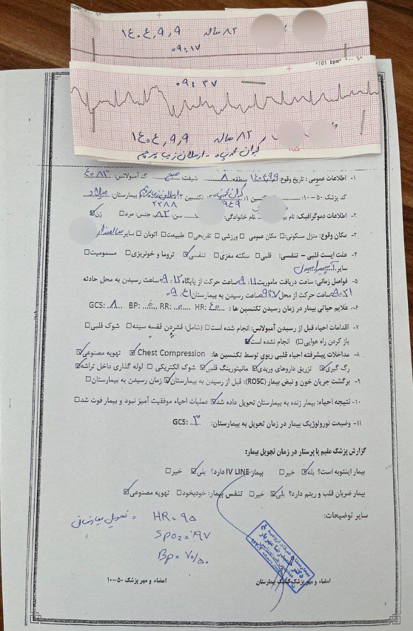 پس از ارزیابی اولیه مشخص شد که مددجوی خانم ۸۲ ساله دچار ارست قلبی–تنفسی شده و تنفسهای Gasping دارد. بلافاصله عملیات احیا طبق جدیدترین پروتکلهای احیای پیشبیمارستانی آغاز شد.
